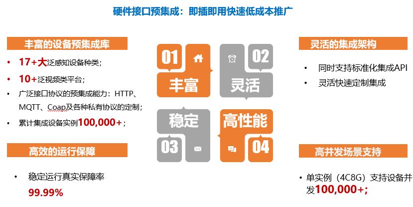 迄今yabo亚博公司已经预集成17+大泛感知设备种类,10+泛视频类平台,广泛接口协议的预集成能力涵盖了HTTP、MQTT、Coap及各种私有协议的定制,累计集成设备实例达100,000+。它还支持标准化集成API,可灵活快速地定制集成,通过构建规则引擎,实现了各设备间的联动应用,比如检测到违规停车,联动广播就会自动播报提醒,为社区管理服务赋能。